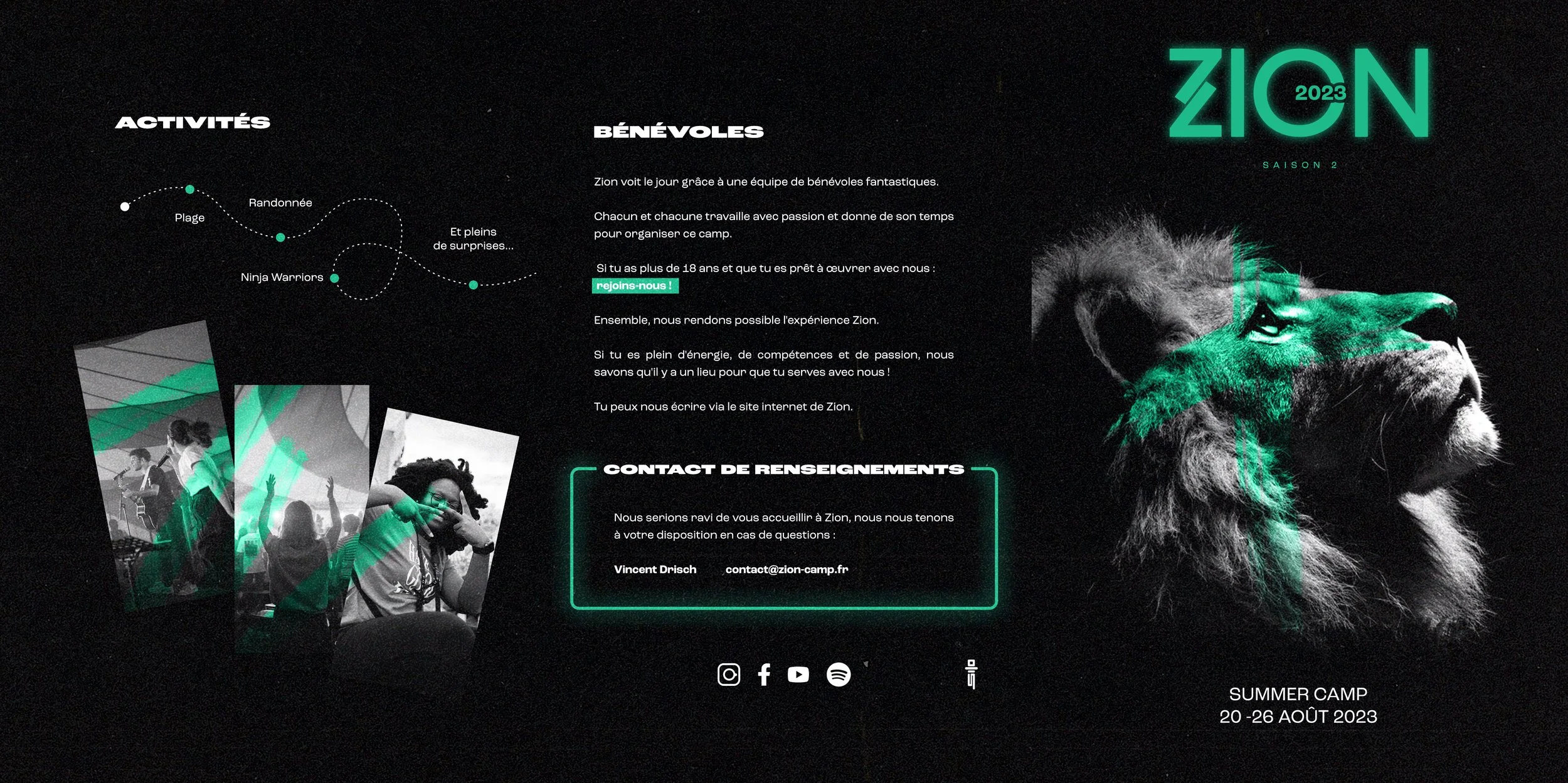 VISUELS 2023 Tu trouveras ici nos différents visuels pour parler de ZION autours de toi 🦁Il te suffit de cliquer sur l’image pour télécharger le fichier que tu souhaites. Affiche A3 Dépliant Slide Powerpoint Flyer